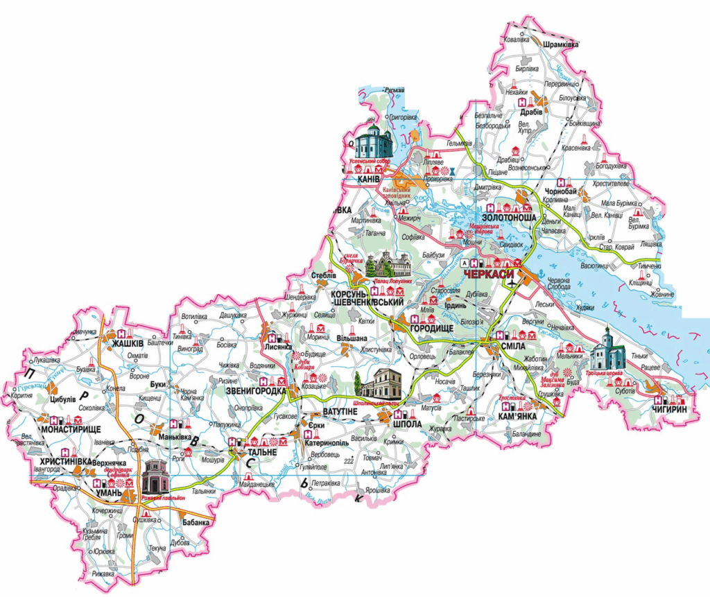 - Звенигородський район: центральна частина, відома як «Шевченків край», що об’єднує Звенигородку, Шполу та Тальне.